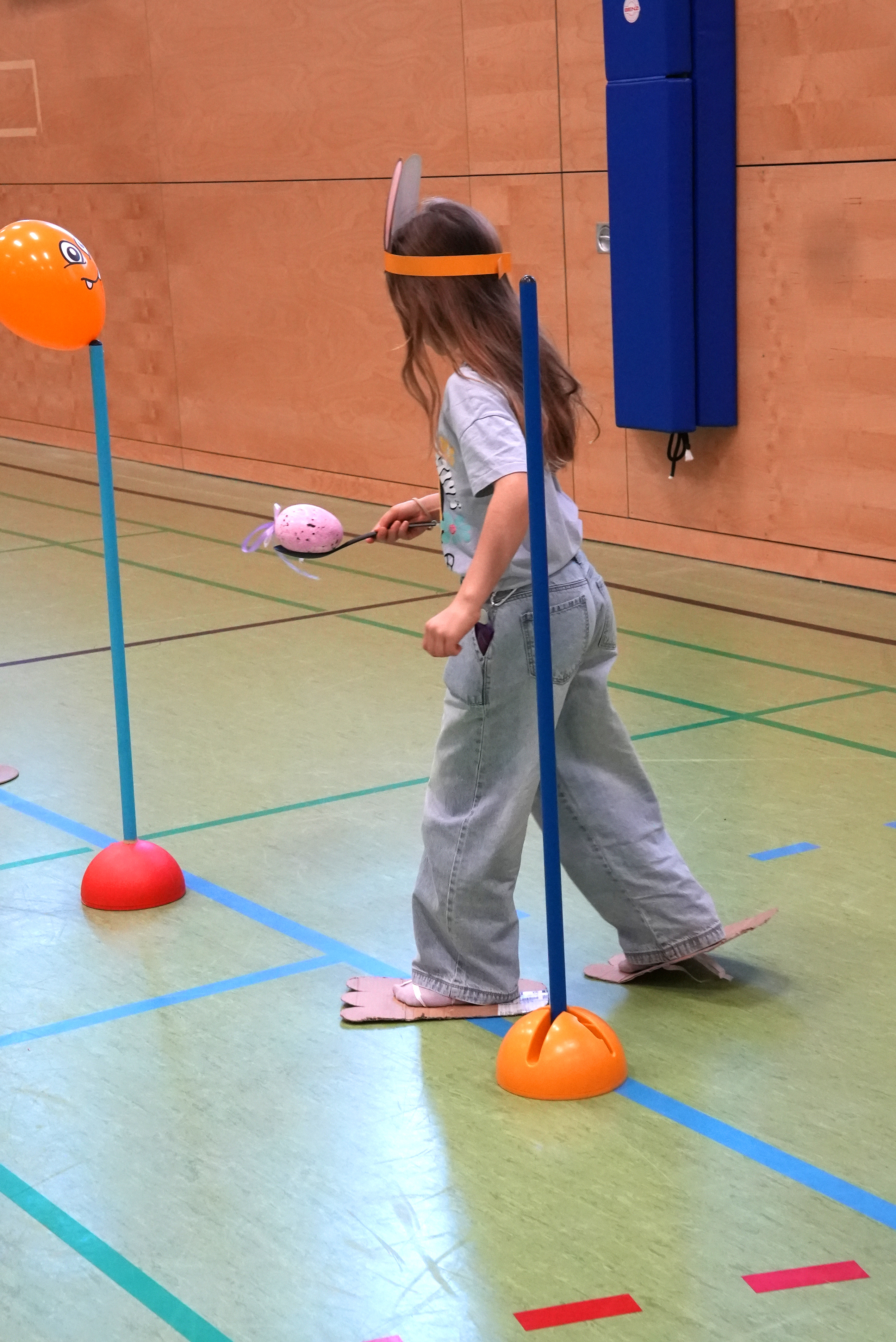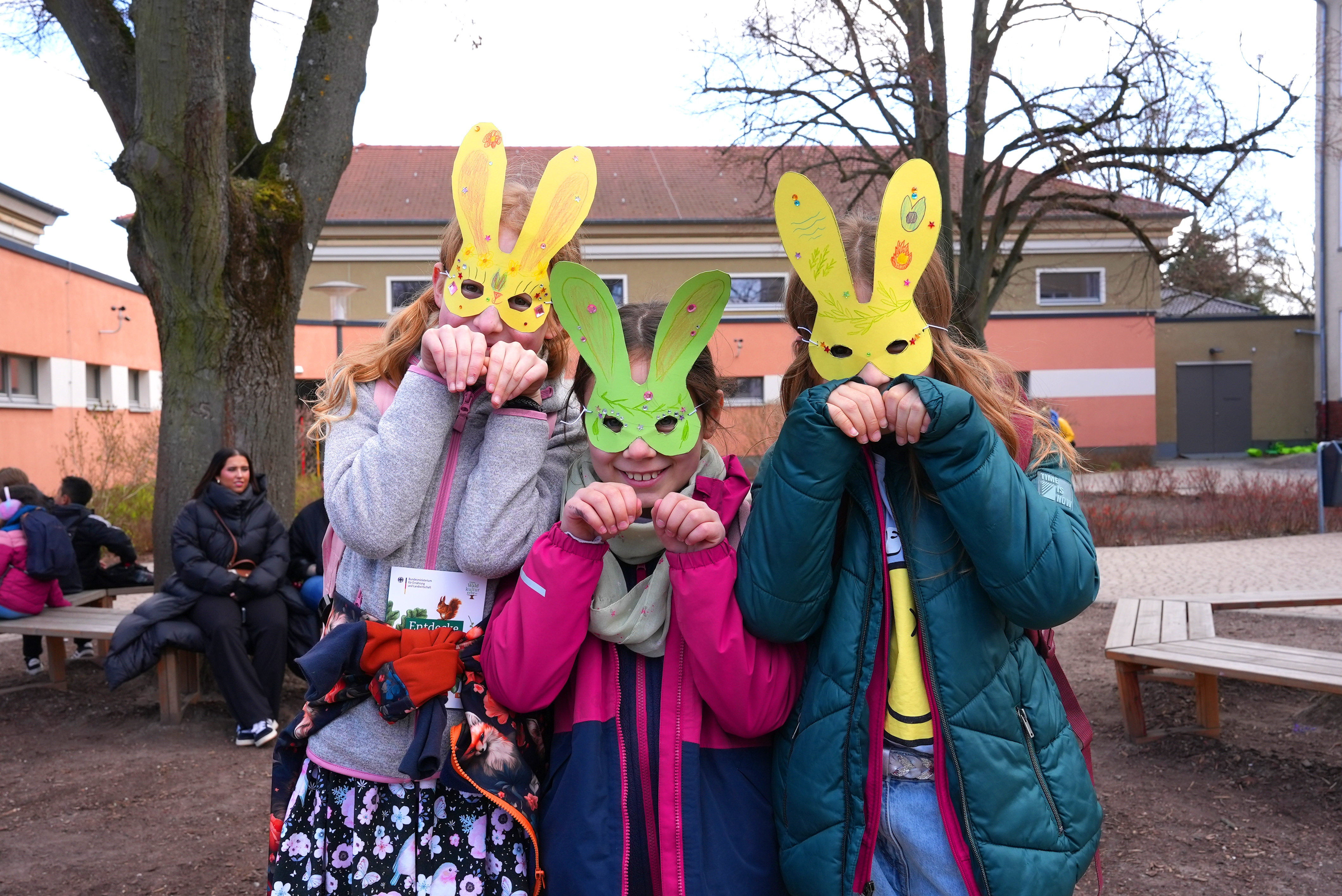 Eine schulübergreifende Aktion am Tag des Aprilscherzes? Dann sollte es natürlich auch lustig werden. Die Mahlsdorfer Grundschule hat zur schulübergreifenden Aktion "Närrische Ostern mit der tjfbg" eingeladen und 250 Kinder aus 29 Grundschulen sind der Einladung gefolgt. Mit Witz, Charme und Hasenohren wurden die Gäste auf dem Schulhof begrüßt und konnten dann an 25 bunten Mitmachstationen kreativ werden, in Bewegung hoppeln, Eier jonglieren, sich schminken lassen - oder dem Lachen widerstehen. Es ist gar nicht so einfach, mit einem Mund voller Wasser nicht zu lachen, wenn Erzieherinnen schlechte und gute Witze erzählen, dich mit einem anderen Namen ansprechen oder Verwandtschaft zu Mitspielenden andichten. Dank Regenmäntel war es kein Problem, wenn das nicht geklappt hat.