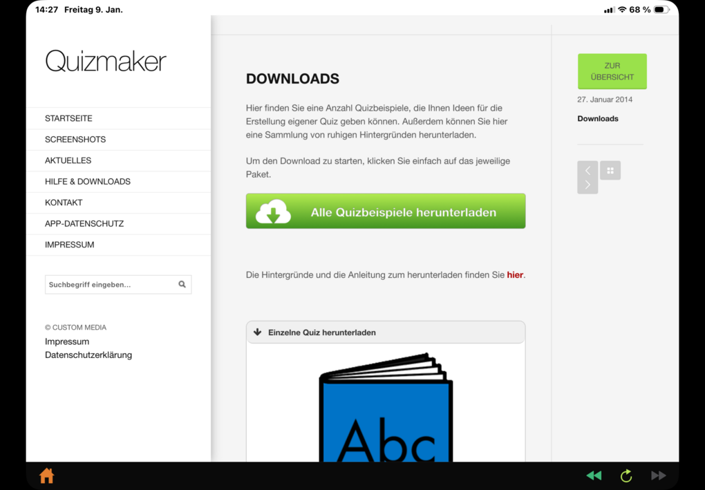 Auf der sich öffnenden Quizmaker-Seite im Menü "Hilfe & Downloads" antippen und "Alle Quizbeispiele herunterladen" (oder einzelne Quiz nach Belieben):