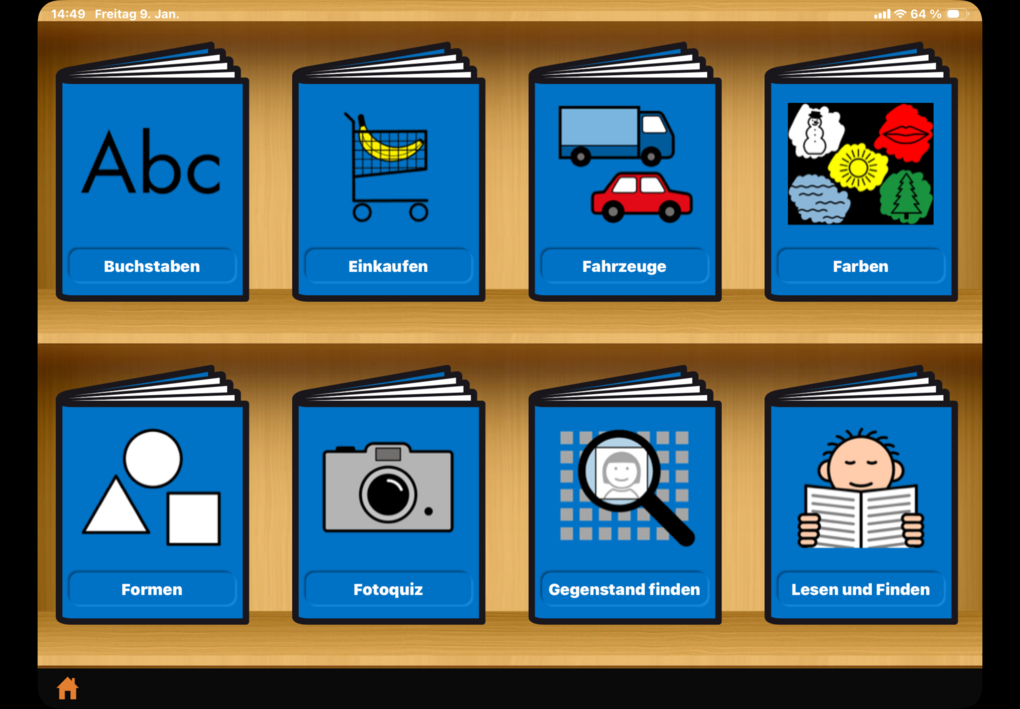 Durch Tippen auf das Haus-Symbol in der Leiste links unten gelangt man zur Startseite der App. Über das Bücherregal gelangt man zur Quiz-Übersicht und kann hier jetzt die heruntergeladenen Quiz ausprobieren: