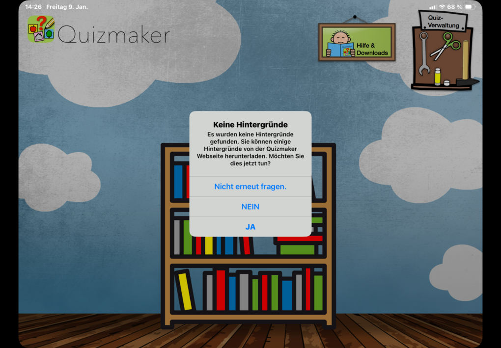 Hat man die App installiert und startet sie zum ersten Mal, wird man in einem Start-Dialog gefragt, ob man Quiz-Beispiele von der Seite herunterladen möchte: