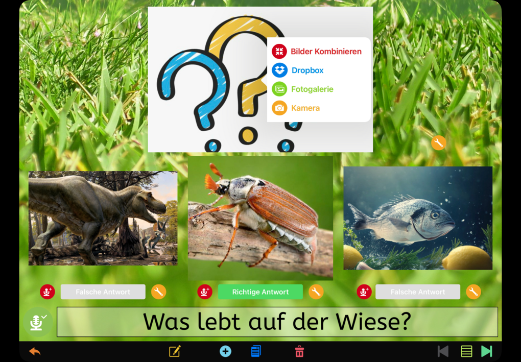 Unten gibt es drei Antwortmöglichkeiten, wovon die "Richtige Antwort" nach Bedarf zugewiesen wird. Die Antworten können als Bilder hinzugefügt und zusätzlich mit einer Sprachaufnahme versehen werden (Symbol: Mikrofon)