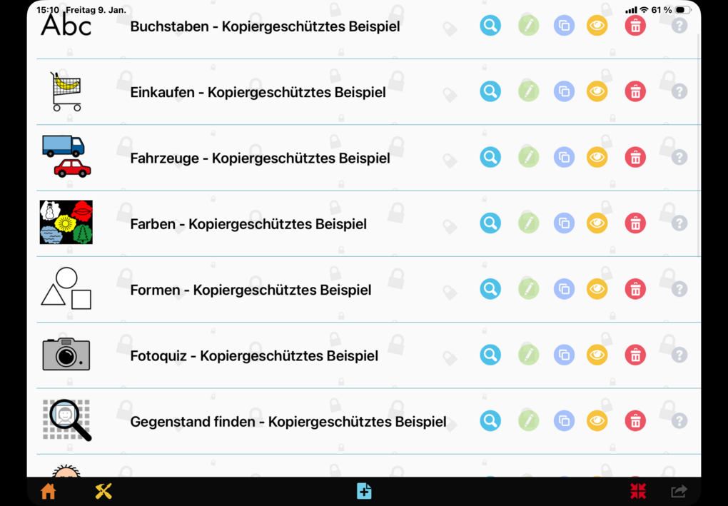 Über die Quiz-Verwaltung rechts oben gelangt man zum Quiz-Editor. (Quiz-Verwaltung 3 Sekunden gedrückt halten zum Öffnen) und findet dort die Übersicht aller in der App vorhandenen Quiz. Man kann die Quiz anschauen (Symbol: Lupe), bearbeiten (Symbol: Stift), duplizieren (Symbol: Doppeltes Blatt), verbergen/sichtbar machen im Regal (Symbol: Auge) und löschen (Symbol: Papierkorb). Über die Leiste unten gelangt man zurück zur Startseite (Symbol: Haus), zu den Einstellungen (Symbol: Werkzeug) und zum Editor zum Erstellen eigener Quiz (Symbol: Plus):