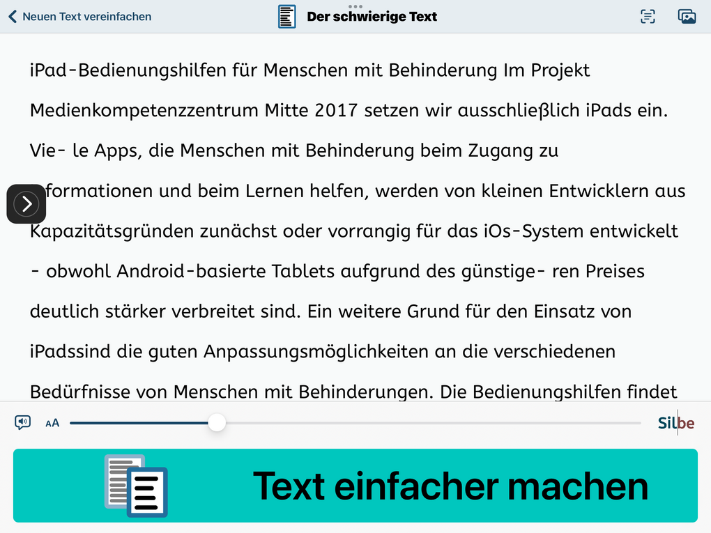 Die App Textvereinfacher von Christian Urff, der bislang vor allem für seine zahlreichen Mathe-Apps bekannt ist (die auch in unserem App-Katalog vorgestellt werden), wurde uns auf der letzten Austauschrunde der Stiftung barrierefrei kommunizieren! Best of barrierefrei 2023: Bedienungshilfen, KI-Tools und Co. empfohlen. Die App ermöglicht - auf Basis von Chat GPT - digitale, gedruckte oder Texte aus dem Internet zu vereinfachen - und zwar nach einem individuell einstellbaren Schwierigkeitsgrad. Eine Vorlesefunktion ist natürlich ebenfalls enthalten. Die Bedienung der App ist sehr einfach - wir stellen hier die Option vor, einen gedruckten Text zu fotografieren und zu vereinfachen: