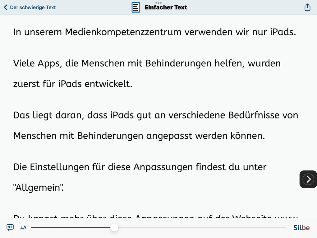 Jetzt erscheint der - mittels der integrierten OCR-Funktion (Abkürzung für "Optical Character Recognition", deutsch: "Optische Zeichenerkennung", eine Funktion, die gedruckten in digitalen Text umwandelt) - der gedruckte Text als digitaler Text in der App und kann z. B. vorgelesen oder vergrößert dargestellt werden:
