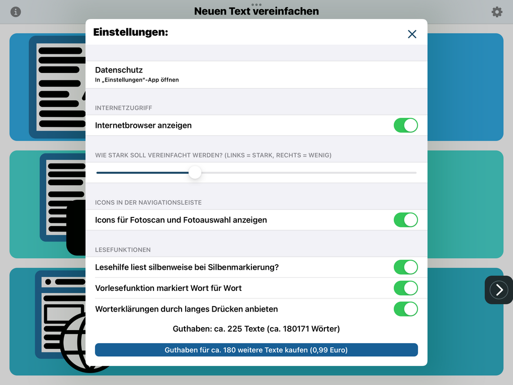 Über die Einstellungen (Zahnrad-Symbol auf der Startseite) kann eingestellt werden, wie stark der Text vereinfacht werden soll, außerdem gibt es Einstellungsmöglichkeiten für die Vorlesefunktion (z. B. silbenweises Vorlesen, Wortmarkierung beim Vorlesen):