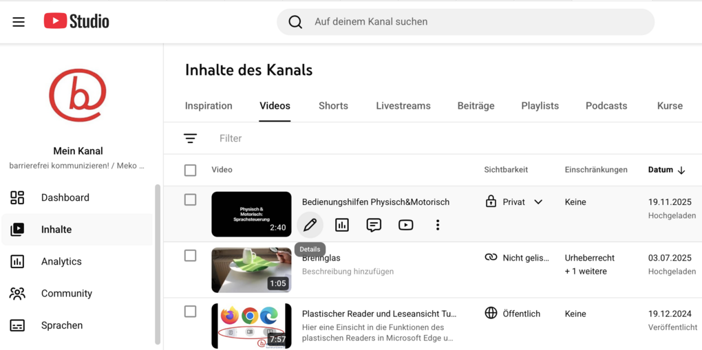 Das Video ist jetzt in der Videoübersicht unter "Inhalte des Kanals" zu finden. Mit der Maus über das Video fahren und auf den erscheinenden Stift-Button klicken.