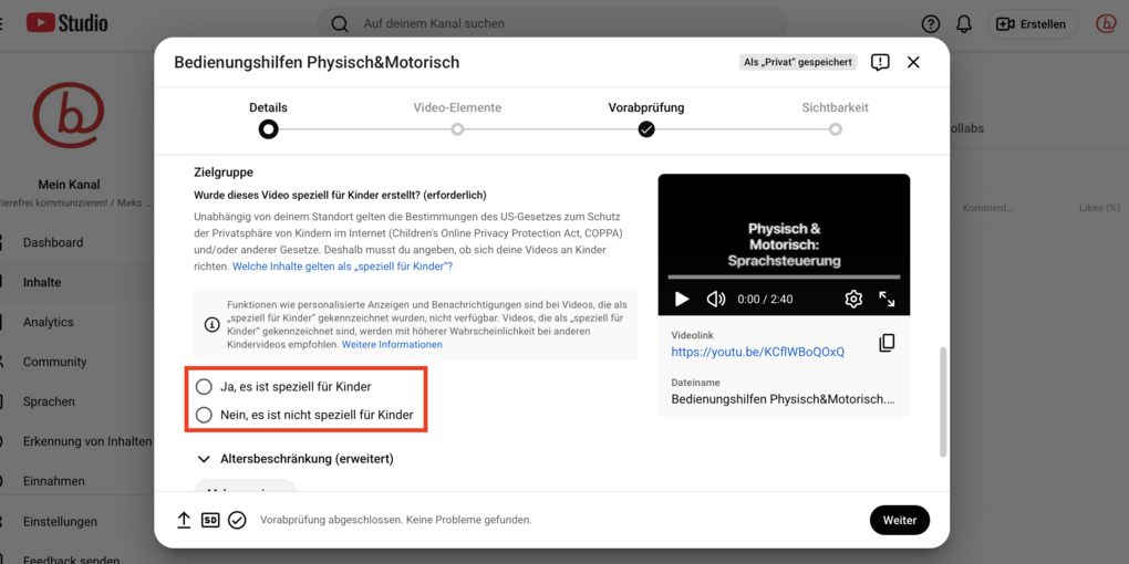 Die Kennzeichnung "Ja, es ist speziell für Kinder" / "Nein, es ist nicht speziell für Kinder" ist verpflichtend - Weiter: