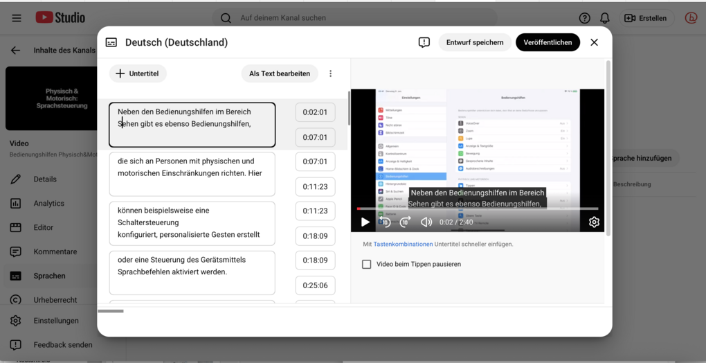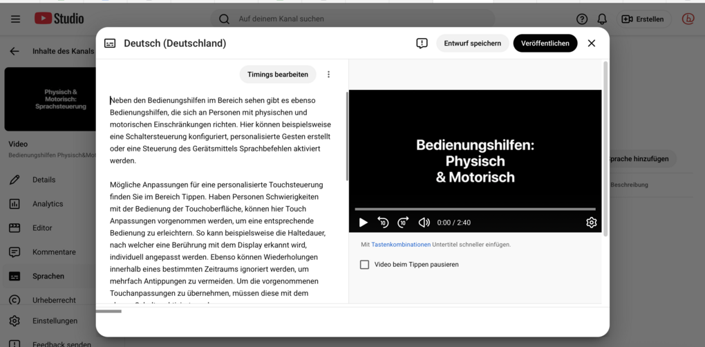 Über "Timings bearbeiten" können bei Bedarf auch die Zeitangaben - d. h. die Stelle, an der der Untertitel ausgespielt wird, bearbeitet werden. Zuletzt speichern und Veröffentlichen.