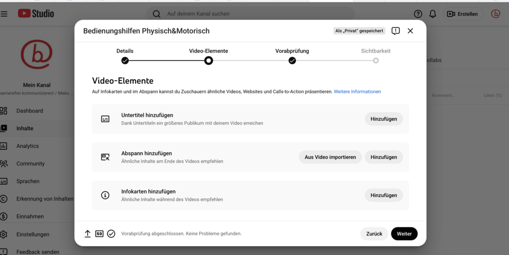 Im folgenden Schritt ist es möglich, Untertitel hinzufügen, z. B. Untertiteldateien, die man z. B. über ein Whisper-Tool erstellt. Oder es liegt für das Video bereits ein Textsckipt vor, das alles Gesprochene enthält: Dann könnte man es hier ebenfalls hochladen, der Text wird dann automatisch synchronisiert und über zugewiesene Timecode an der richtigen Stelle als Untertitel abgespielt. Um Untertitel automatisch zu generieren, diesen Schritt ignorieren und 2x "Weiter" klicken.