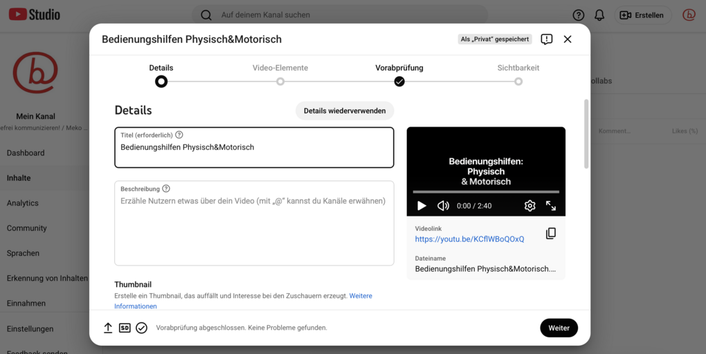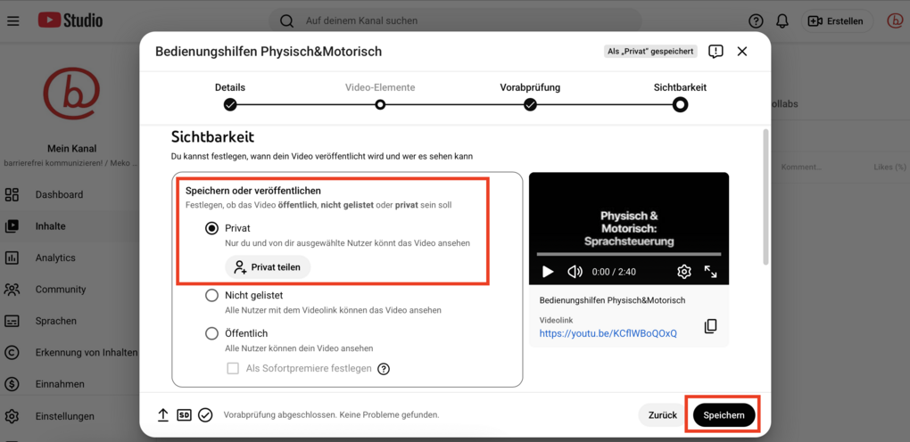 Bei "Sichtbarkeit" festlegen, wer das Video sehen kann. (Auf "Privat" setzen, wenn man es nicht finden soll auf YouTube) - Speichern