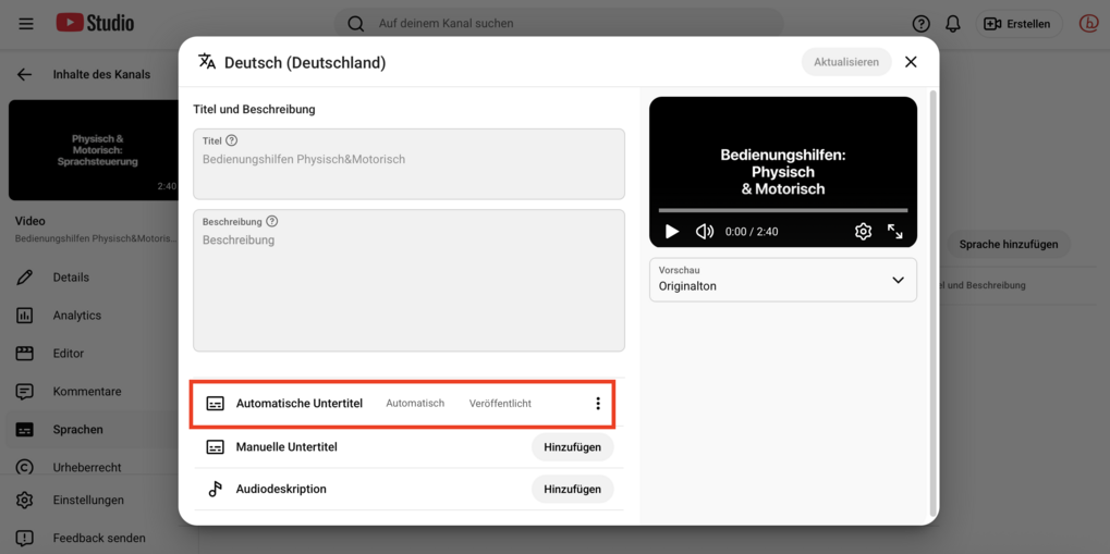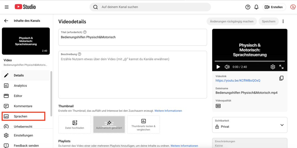 Die Seite "Videodetails" öffnet sich - "Sprachen" klicken (Menü links).