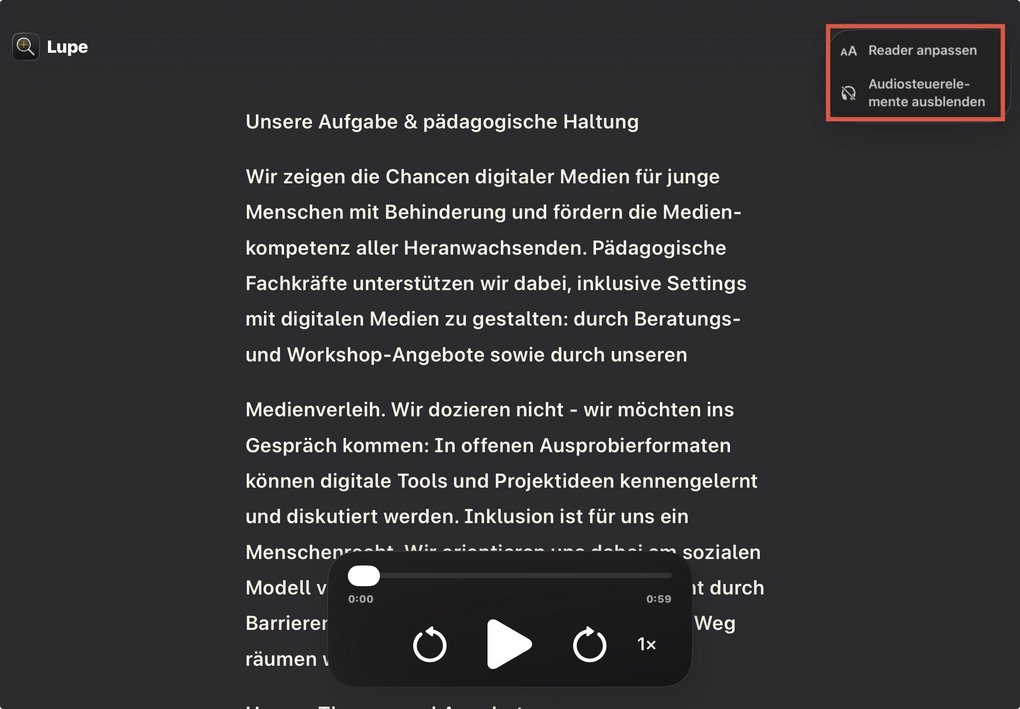 Den Reader antippen - jetzt wird der erkannte Text im Reader-Modus angezeigt, eventuell vorhandene Bilder im Textfoto ausgeblendet. Im unteren Teil ist das Audiosteuerelement - hiermit kann man den Text vorlesen, vor- und zurückspulen, sowie die Vorlesegeschwindigkeit beeinflussen. Oben rechts sind drei Punkte, diese tippen, um den Reader optisch anzupassen und / oder das Audiosteuerelement auszublenden, falls man z. B. die Vorlesefunktion nicht nutzen möchte.
