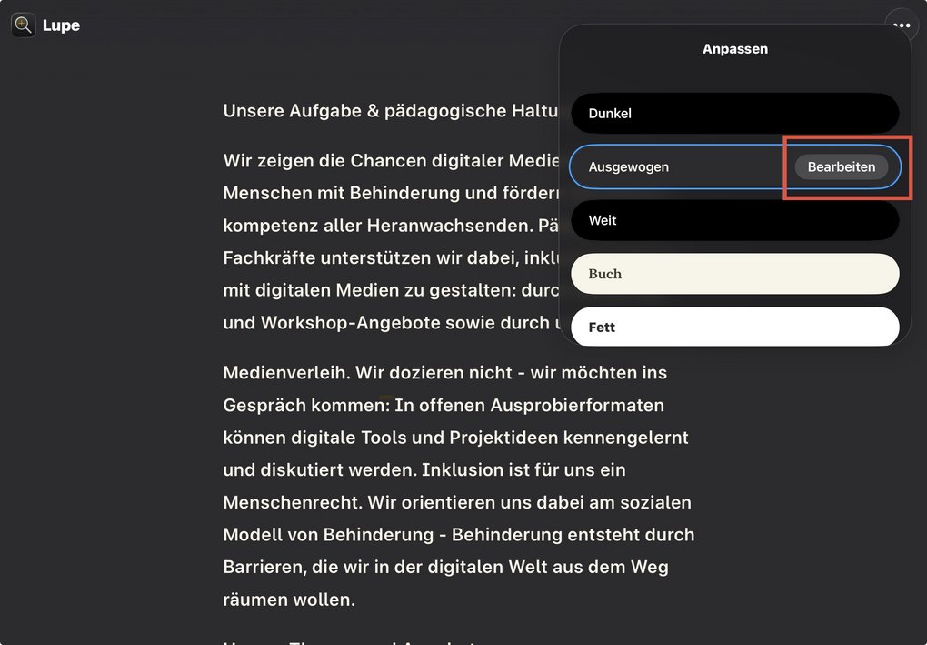 Die iOS-Lupe hat jetzt seit Neuestem auch eine Readerfunktion integriert, mit der gedruckter Text erkannt und vorgelesen werden kann. Das gibt es zwar schon seit Längerem durch die in die Kamera-App integrierte Live-Text-Funktion (Anleitung zur Live-Text-Funktion) - dabei bleibt aber das Aussehen des Textes grundsätzlich erhalten. Menschen mit einer Sehbehinderung, aber auch Menschen mit Legasthenie oder Leseeinschränkungen aufgrund einer neurodiversen Wahrnehmung profitieren jedoch nicht nur von einer Vorlesefunktion, sondern auch davon, den Text visuell an eigene Bedarfe anzupassen. Zum Beispiel die Schriftart zu verändern, Farbe von Text und Hintergrund anzupassen usw. Das alles bieten sogenannte Reader-Funktionen, die man bereits von verschiedenen Browsern kennt. Diese haben wir ebenfalls bereits in unseren Tool-Tipps vorgestellt: